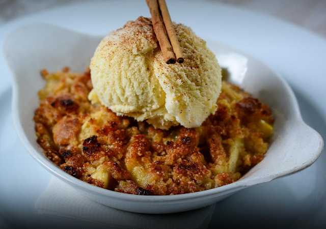 - O tradicional crumble de maçă acompanhado com uma bola de gelado de baunilha, aromatizado com canela.