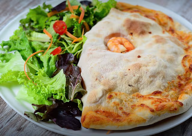 - Massa de pizza recheada com molho de tomate, espinafres frescos, queijo ricotta, ovo e queijo mozzarella, com salada.