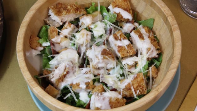Bocconcini di pollo fatti da noi con impanatura croccante del nostro pane, accompagnati da maionese light e salsina barbecue affumicata.