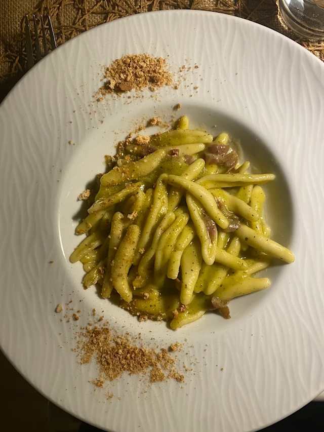 - Cavatello tre dita al salto di crema di zucca, guanciale croccante e ristretto al vino aromatico