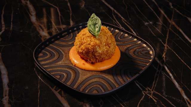 - Tris di crocchette dorate, farcite con mozzarella fiordilatte in acqua e lardo stagionato all'erbe, in uscita fonduta di grana