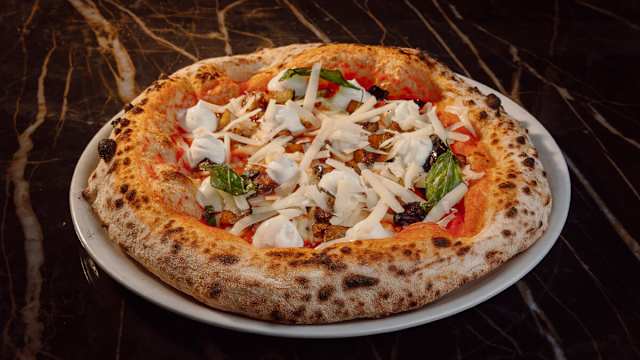 - Salsa di pomodoro san marzano , mozzarella fiordilatte campana in acqua, dadolata di melanzane nere nostrane, fiocchi di ricotta di bufala salernitana, spolverata di parmigiano reggiano DOP 24 mesi, basilico, olio extravergine d'oliva pizzolium