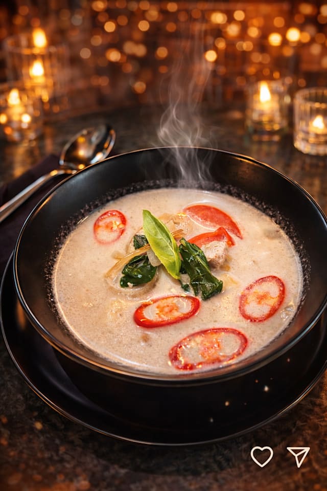 - Caldo de leite de coco picante com frango, cogumelos, pimentos, temperos aromáticos, malagueta e sumo de lima