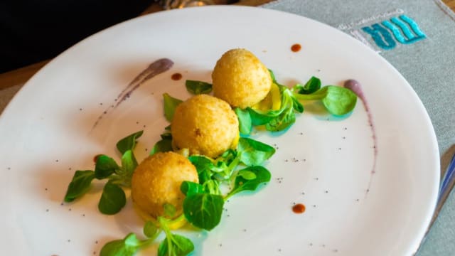 Croccanti pepite di baccalà fritte con maestria, accompagnate con della cipolla caramellata
