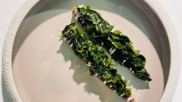 Pescatrice al vapore con polvere di alghe tostate, lattuga di mare e salsa allo yogurt