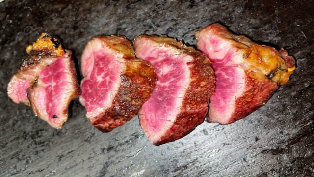 Fondo di arrosto di rubia gallega, polvere di thè macha, limone candito e polvere di caffè e lardo di colonnata