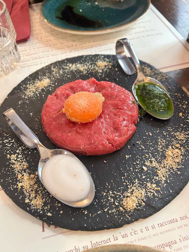 - Tartare di manzo con uovo fritto , salsa yougurt e salsa verde