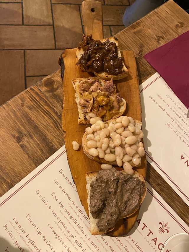 - Crostini misti di pane, lampredotto, peposo, fegatini, fagioli