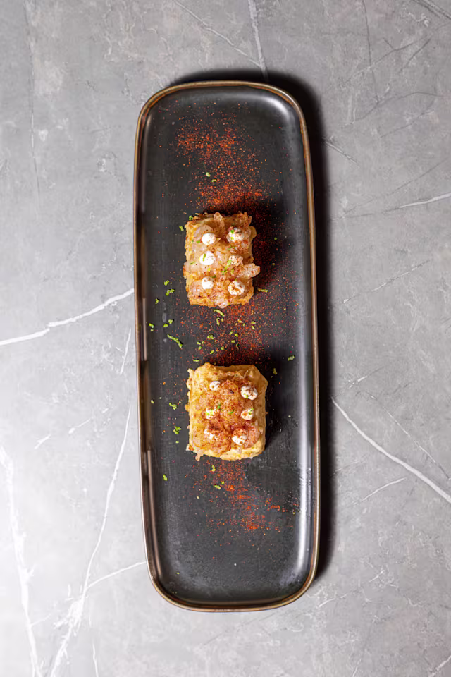 - Due frittatine di pasta alla cacio e pepe, tartare di gambero argentino aromatizzato all'arancia, maionese,scorza di lime e paprika.