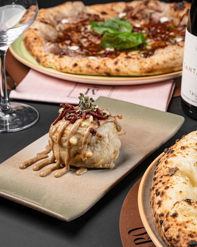 - Crema di *piselli, fior di latte di vico equense DOP, pomodorini gialli confit, stracciata di bufala DOP, tonno rosso, cipolla rossa di tropea croccante, guanciale croccante, olio evo