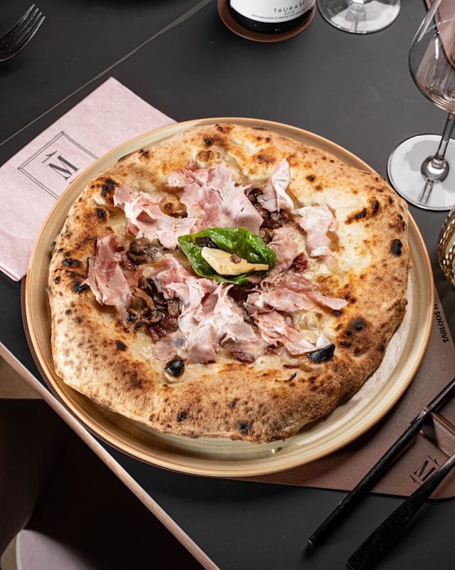 - Fior di latte di vico equense DOP, funghi, cotto di maiale casertano, salame napoli, carciofi cilentani, olive caiazzane, grana padano 24 mesi DOP, olio evo