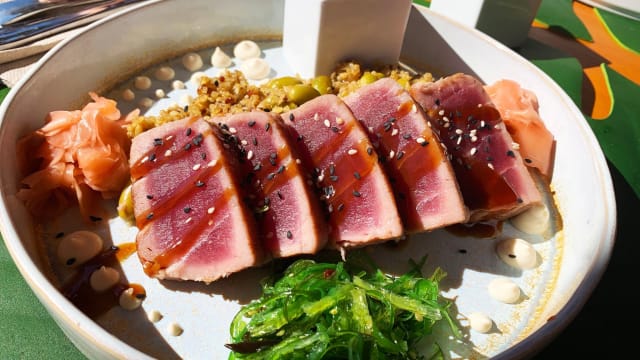 - Tataki de atún o salmón con wakame, sésamo y teriyaki