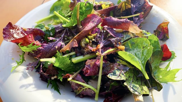 - Ensalada de queso puro de cabra gratinado con nueces caramelizadas, miel mostaza y pipas de calabaza