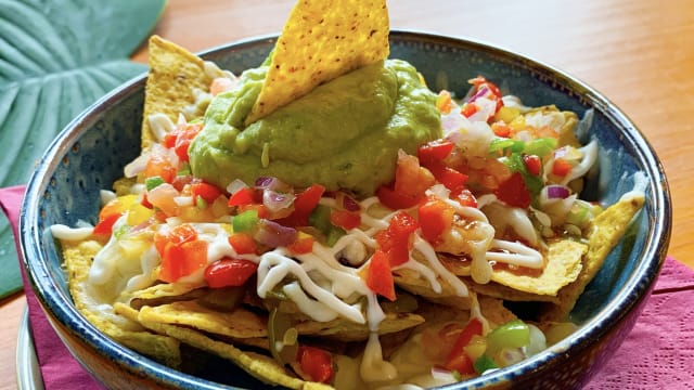 - Nachos maui con queso fundido, guacamole, jalapeños y pico de gallo