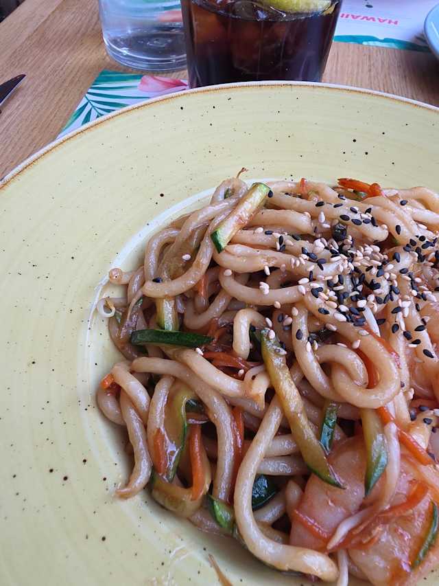 Udon, straccetti di pollo saltato con carote, zucchine, germogli di soia, sesamo bianco e nero, e salsa teriyaki