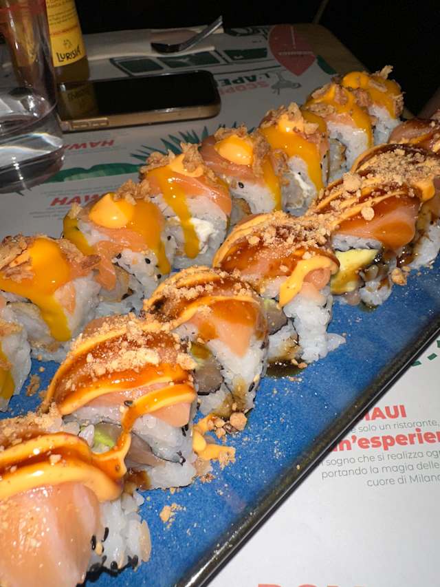 Gambero in tempura, philamaui, salmone, spicy mayo, riso, sesamo bianco e nero, salsa al mango e cipolla croccante