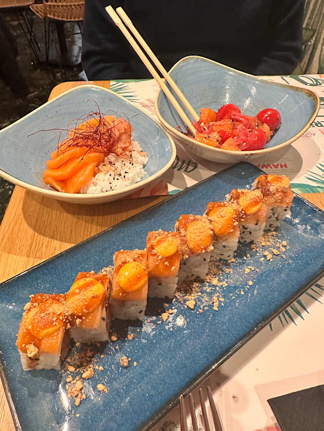 Salmone, avocado, alga nori, riso, sesamo bianco e nero, spicy mayo, salsa teriyaki e granella di anacardi
