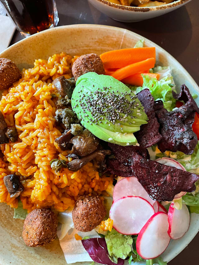 Gefüllt mit einer spicy reis-quinoa-mischung, knackigem salat und superfoods wie avocado mit chiasamen, edamame, tomaten, radieschen, champignons, kapern, möhren und rote bete chips