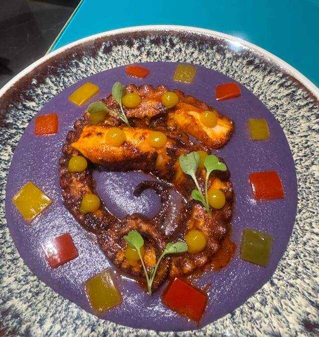 Tentacoli di polpo croccanti alla plancha in sentore di paprika affumicata su crema di patate viola. Servito con peperone in carpione in doppia consistenza.