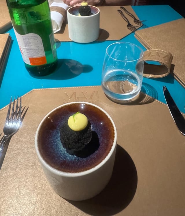 Fave e piselli alla brace adagiati su cremosa stracciatella con acciughe del Mar Cantabrico; serviti con focaccia di patate e alga spirulina in tocco di mare.