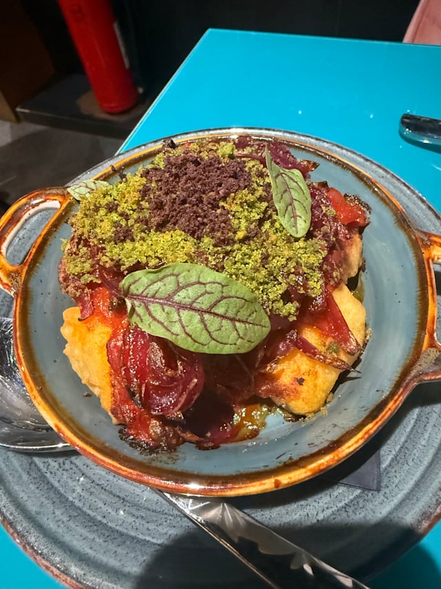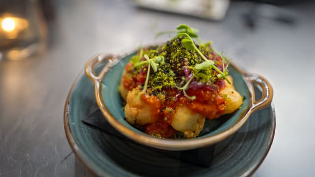 La tempura croccante esalta la morbidezza del baccalà in un contrappunto di consistenze, rifinito da cipolla caramellata allo sherry, salsa datterino e crumble di olive nere.