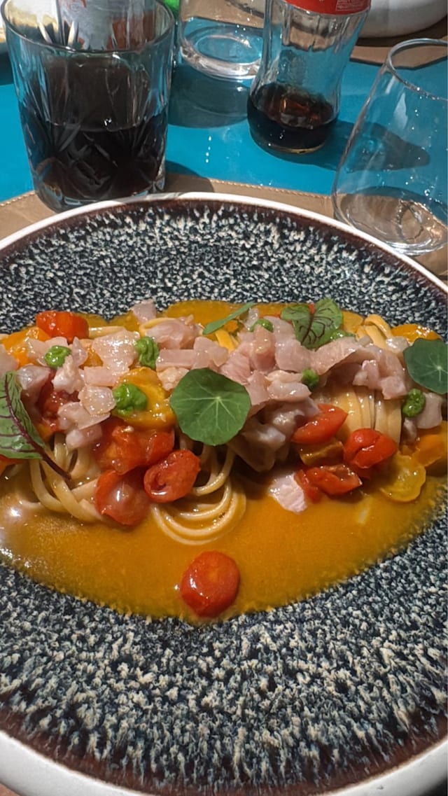 Linguine o paccheri unitamente al radicato pomodorino del piennolo, su- blimano il pescato del giorno di vostra preferenza.