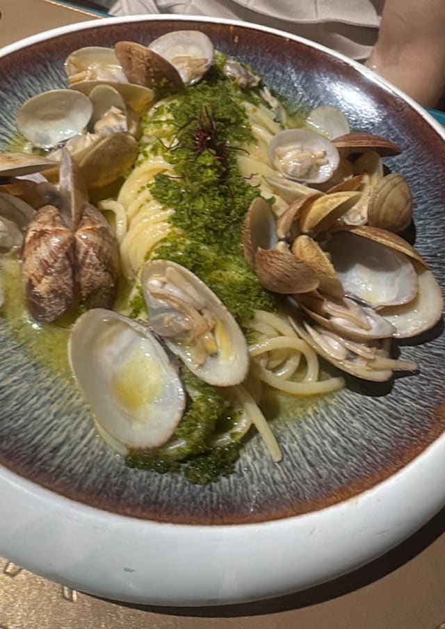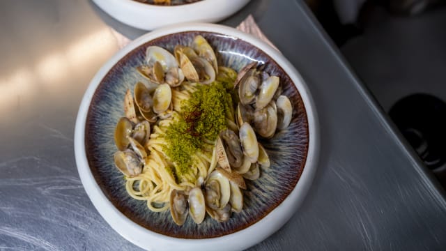Vongole veraci, bottarga di tonno, zest di limone e prezzemolata croccante: si celebra un classico in rivisitazione di una moderna eleganza.