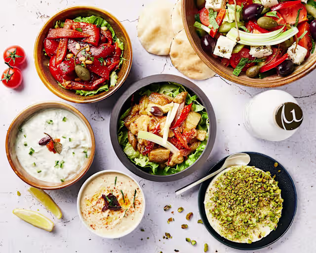 - Aubergine, courgette et poivron grillés, halloumi aop grillé, olive de kalamata, salade, tomate, concombre, fines herbes