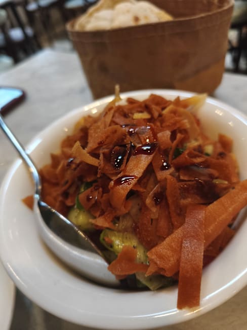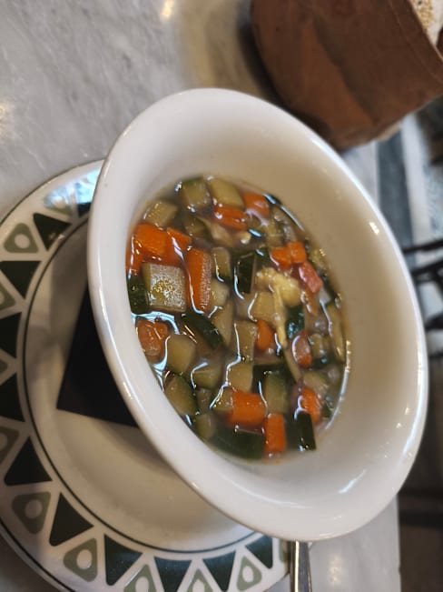 4.5/10+2Not a pleasant experience. Salad components were old, chicken kebab is pre-cooked, grilled potato/onions are pre-cooked. Arayes are likely frozen and heated on order as the meat was very dry. The pepper with the chicken kebab was inedible rubber. Tahini has too much salt. Chicken soup with barely any chicken and on top of that it's tough as rubber, likely pre-cooked, stale and then heated for the soup. Falafel has no herbs inside.