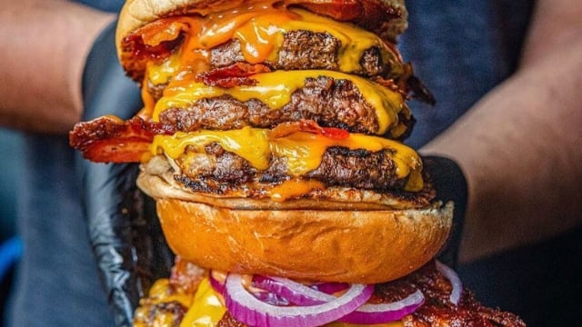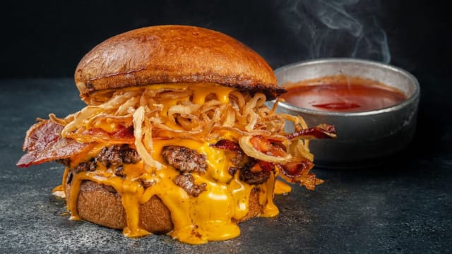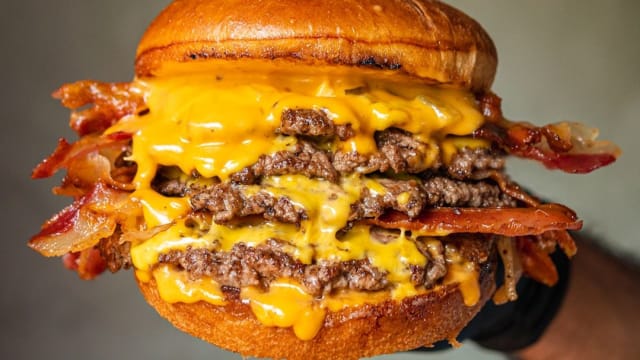 180 gramas de carne, duplo cheddar, duplo bacon, cebola frita, ovo estrelado e molho barbecue acompanhado de batata frita.