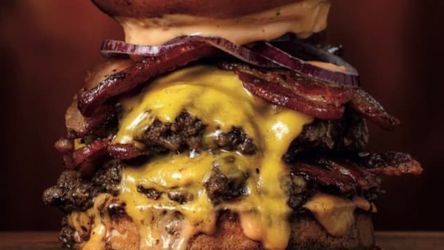 360 gr. Carne, pão tostado ao contrário, triplo cheddar, duplo "sweet bacon", cebola roxa, molho MBH