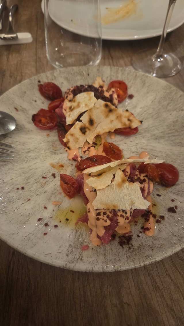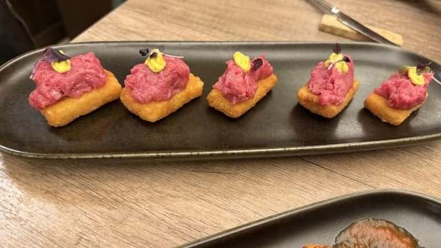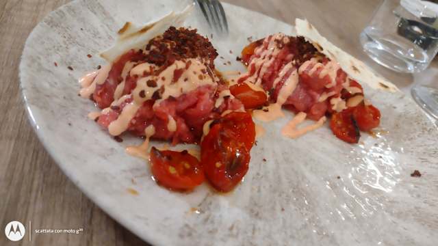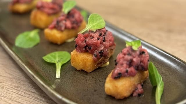 - Tartare di manzo, salsa crispy mediosangue, sesamo bianco