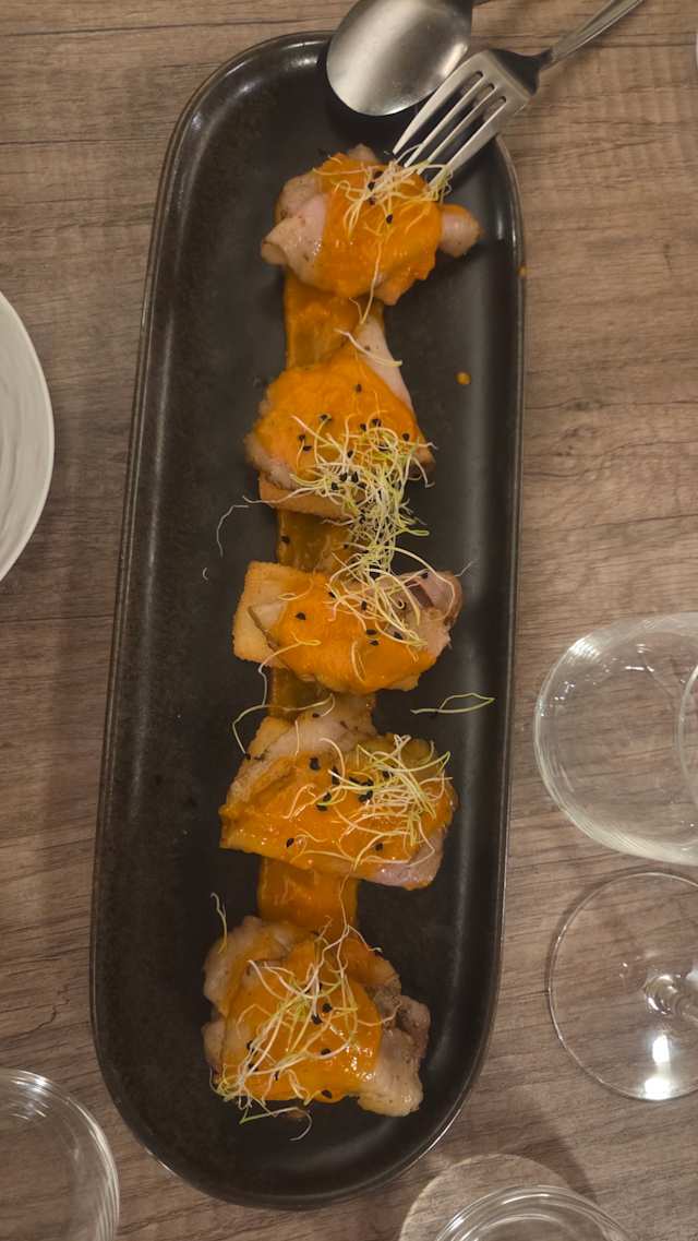 - 5 mattonelline di riso fritte con punta di petto di manzo, speziata, cotta 24h e crema di peperoni in agrodolce