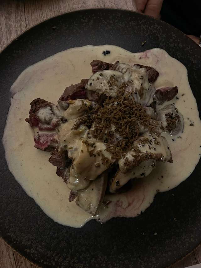 - Con fonduta di pecorino, funghi porcini e cardoncelli e tartufo