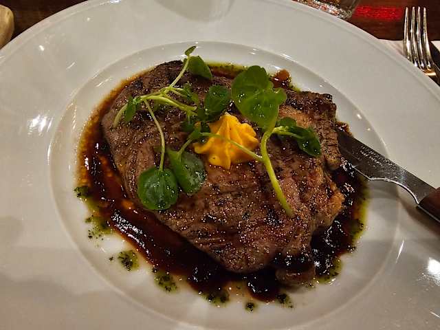 - Grillade entrecote med café de paris smör, rödvinssås, serveras med ugnsstekt klyftpotatis i rosmarin och vitlök, bearnaisesas.