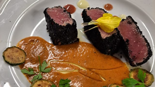 - Tonno in crosta di nero di seppia su salsa alla puttanesca. Gel di limone e olio al prezzemolo