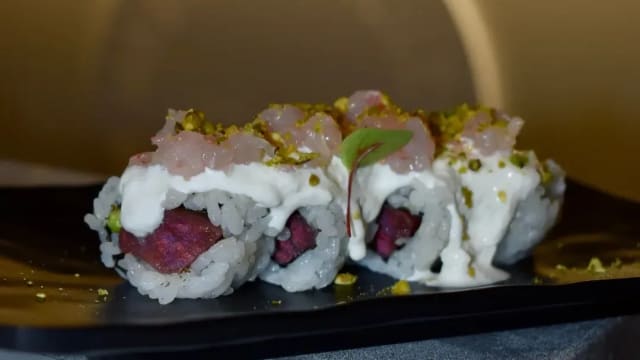 Salmone, avocado, pistacchio, philadelphia, gambero in tempura sopra e teriyaki