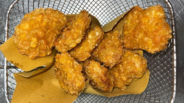 Pollo fritto, lattuga, pomodorini, mais, mozzarella, crostini di pane