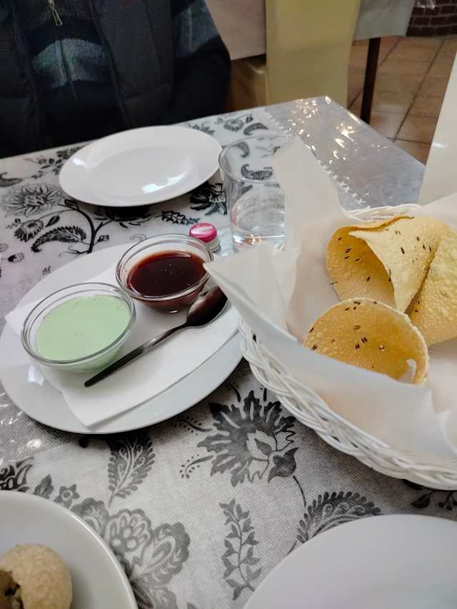 - Sfere di pasta croccante ripiene di patate speziate, ceci e chutney, servite con acqua speziata fresca e piccante.