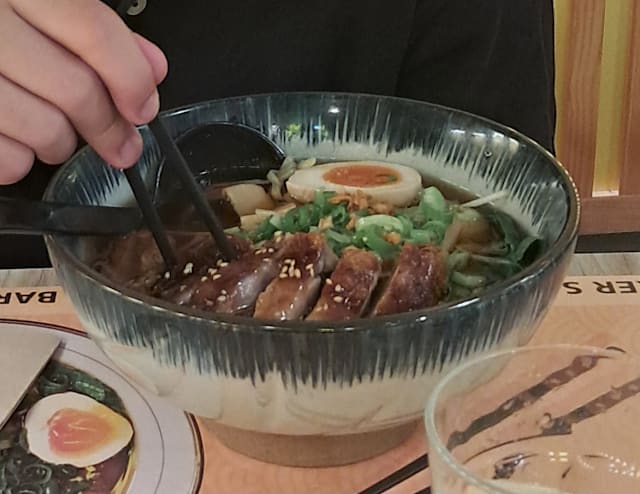 Fideos, caldo de pollo con shoyu, huevo marinado, pato de la casa, pak-choi, col china, bambú, pusto, cebolleta, cebolla frita ramen vegetarlano