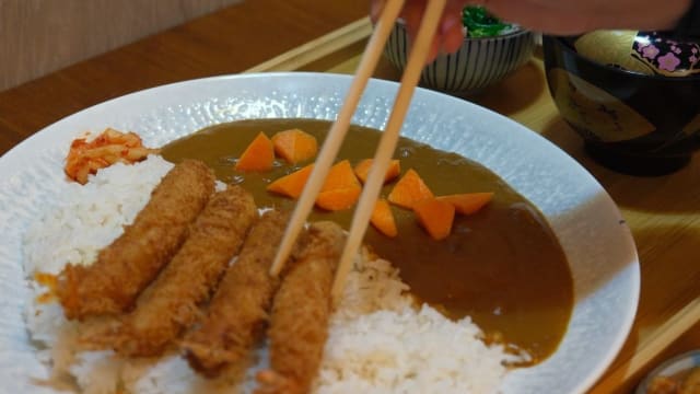 Arroz, tempura de gambas, curry, sopa miso y ensalada