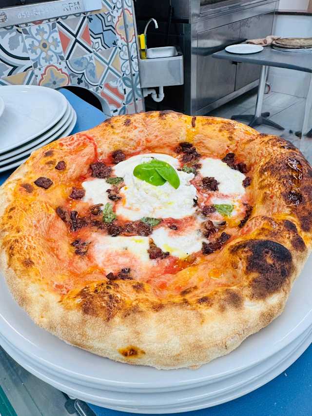 - Pomodoro san marzano dop, provola affumicata, fiordilatte, salsiccia napoletana, profumo di tartufo bianco.
