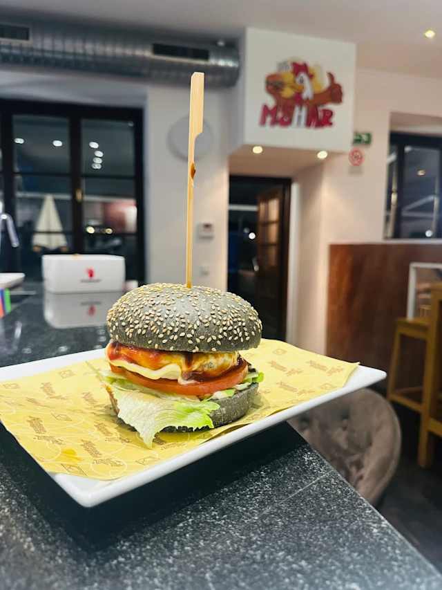 - Panino nero con 200g angususa, bacon, cheddar, pomodoro, insalata, ketchup, maionese e salsa BBQ