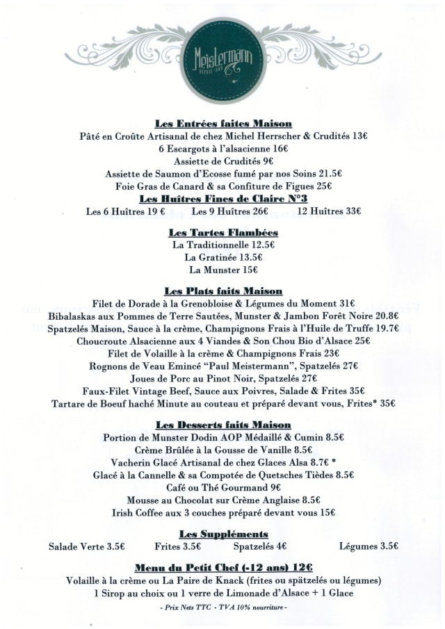 10/10Meistermann is a classic French bistro, slightly removed from the epicentre of tourist mayhem in (beautiful) Colmar. Outside terrace, large a/c wood-panelled interior. Serves traditional Alsatian food, like tarte flambé, bibalaskas and spetzeles, simply but very well cooked. Extensive list of regional wines which the staff were happy to help with. Excellent desserts. We had a delightful evening. Recommended