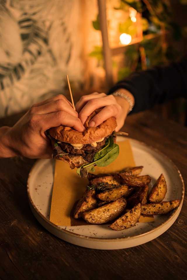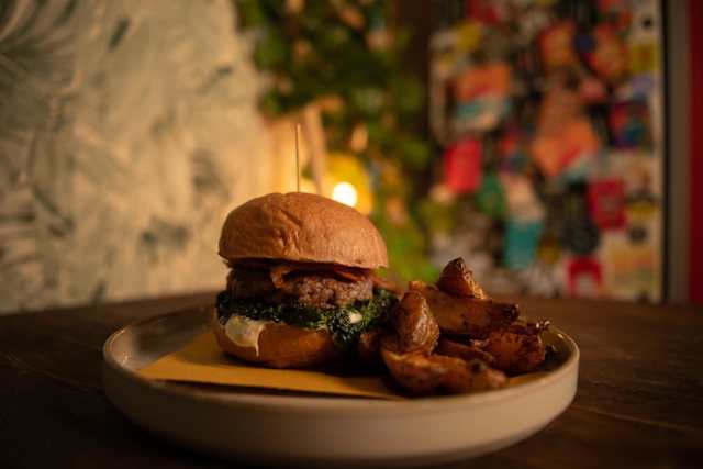 - Hamburger di manzo 200gr (macelleria muccini), cheddar, bacon, uovo all’occhio di bue, ‘nduja calabra e salsa burger. (pane di san patrignano - serviti con patate al forno)