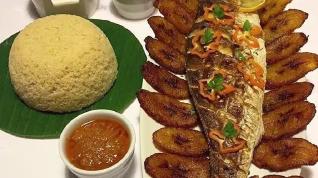 - Attieke(somoule) ou chikwangue(bâton de manoic) ou thieb(riz mijoté sauce tomate),avec les condiments