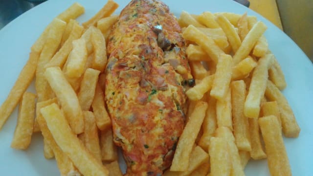 - (Fiambre, queijo, cogumelos, cebola, coentros) batata frita