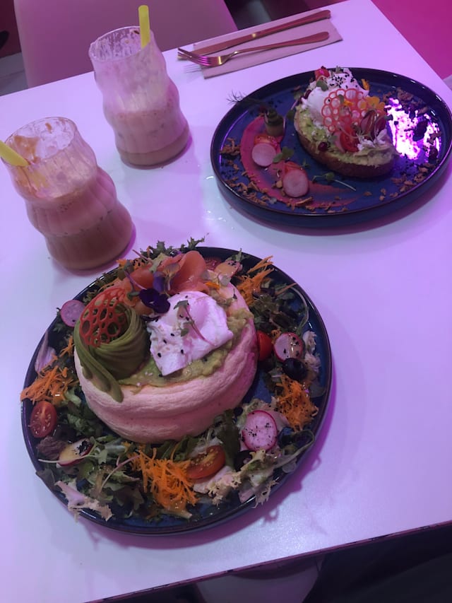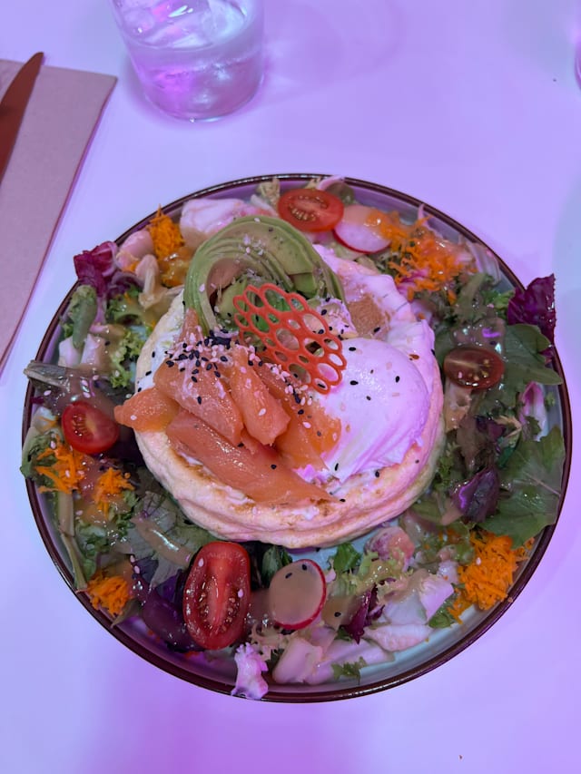 Pan de chusco artesanal tostado, aguacate fresco en forma de flor, huevo poché, queso crema philadelphia y salmón ahumado, semillas de granada y sésamo. Una invitación a la gula con una presentación elegante.
