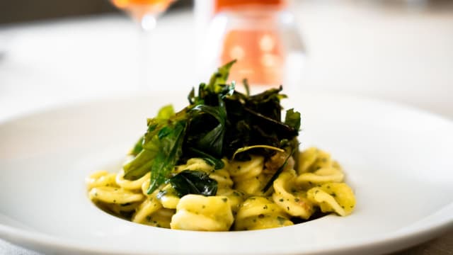 Orecchiette di grano arso, vellutata di zucchine e salvia, bocconcini di zampina e scaglie di cacio ricotta