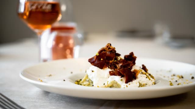 Tartare di tonno fresco, stracciatella, fili di peperoncino, filetti di mandorla tostati e basilico